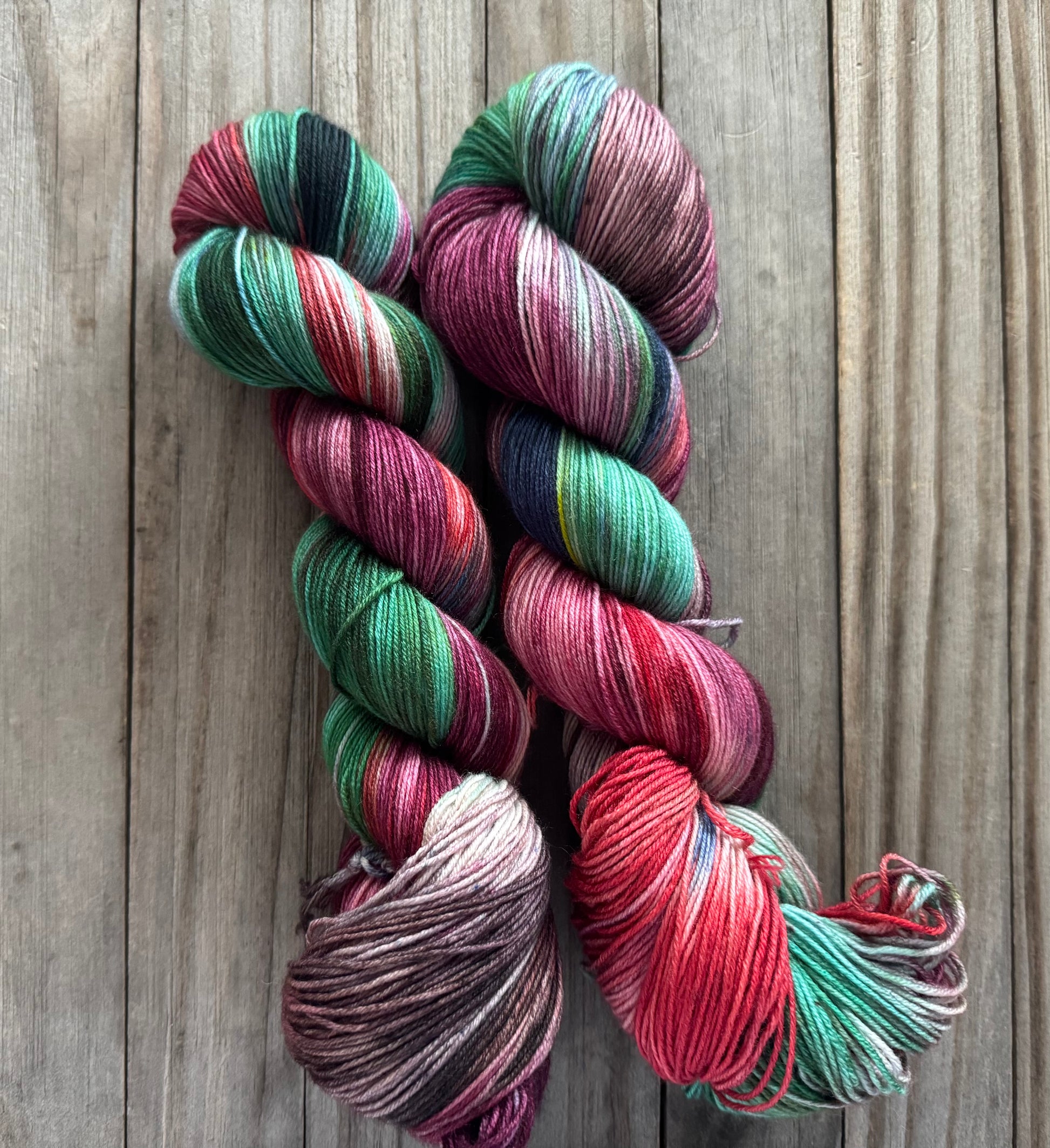 Northern Lights Noel is one of the 2025 Christmas color ways! This colorway has burgundy, red, moss, and chocolate brown variegation.