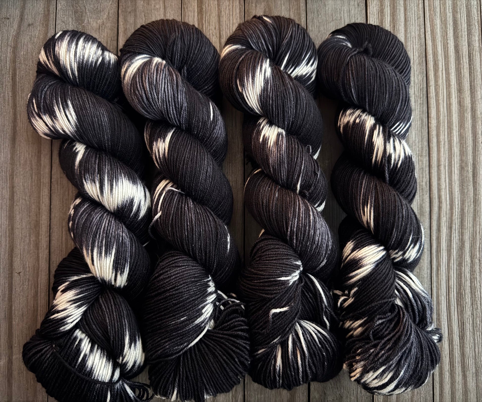 This is a black and white pixel dyed color way that will pair well with almost anything. Pair it with a skein of Monarch to create a true monarch butterfly feeling.